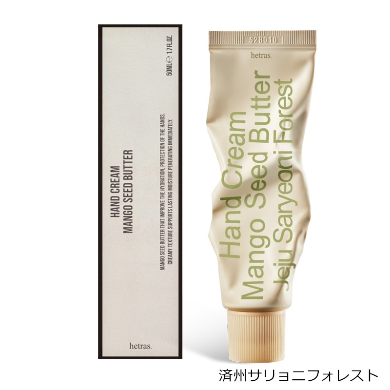 韓国発ライフスタイル・フレグランスブランド「hetras.(へトラス)」のマンゴーシードバター(※)を配合した、香りと使用感にこだわったフレグランスハンドクリーム。軽やかなテクスチャーで手肌にすっとなじみ、うるおいを与えながら乾燥を防ぎます。シルクのようななめらかさをイメージした使い心地と、香水のように洗練された香りは、気分をリフレッシュしたい時にもおすすめ。好みに合わせて選べる、全5種の香りとパッケージはギフトにもぴったりです。