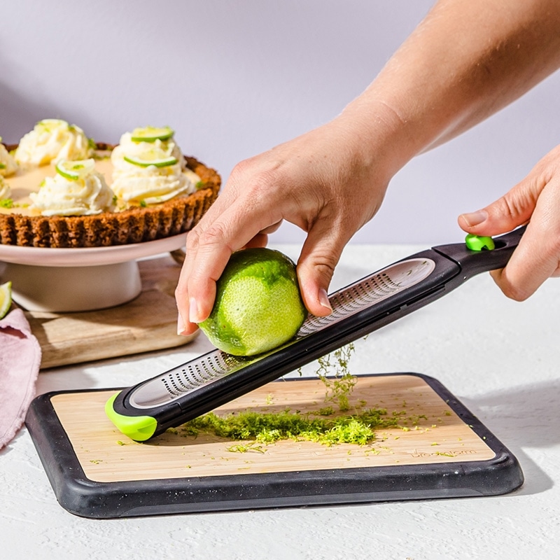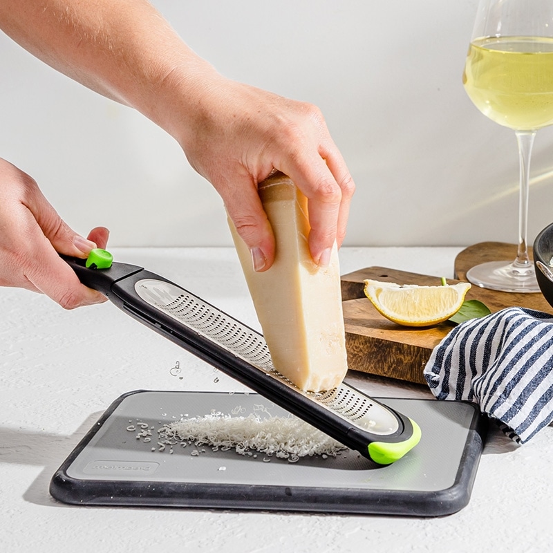 ボタンひと押しで、グレーターに付いた食材を瞬時に落とせる便利なキッチンツールです。付属のブレードカバーは刃をしっかり保護するだけでなく、すりおろした食材をキャッチしてくれる多機能設計。さらにメモリ付きで、すりおろした食材の容量も一目で確認できます。ライムやレモンなどの果物から、チーズ、しょうが、にんにく、ナツメグ、チョコレートまで幅広く活躍します。