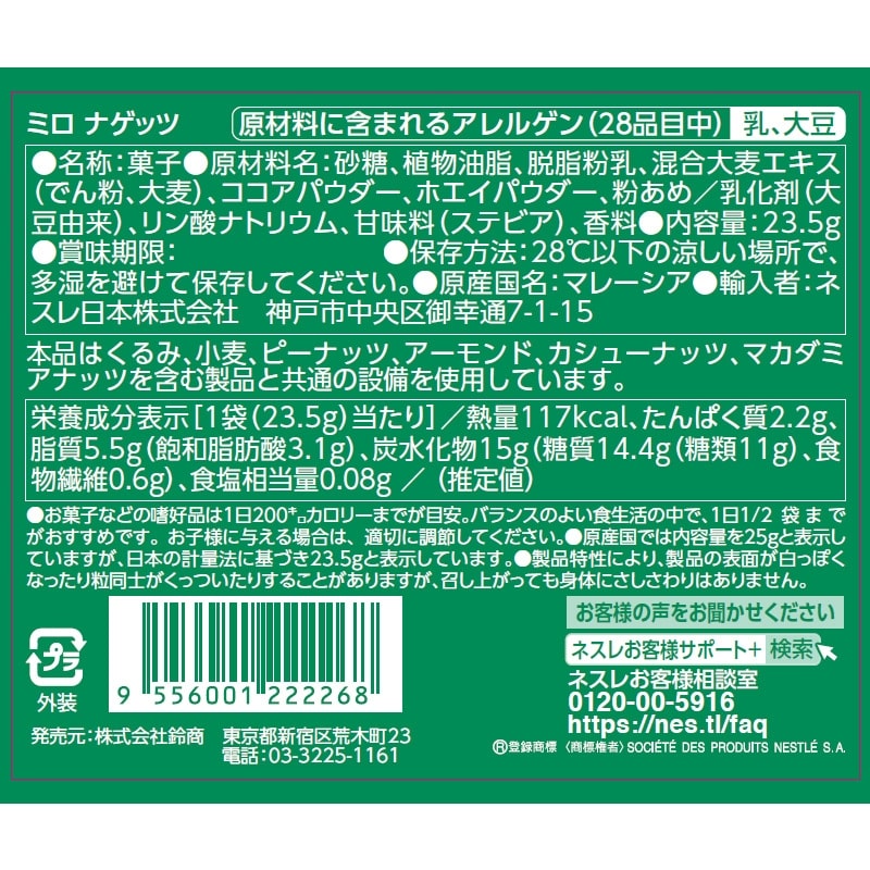ミロナゲッツから、食べきりサイズがラインアップ。サクサクと軽い食感のミロ風味スナックをチョコレートでコーティングした、ひと口サイズのお菓子です。